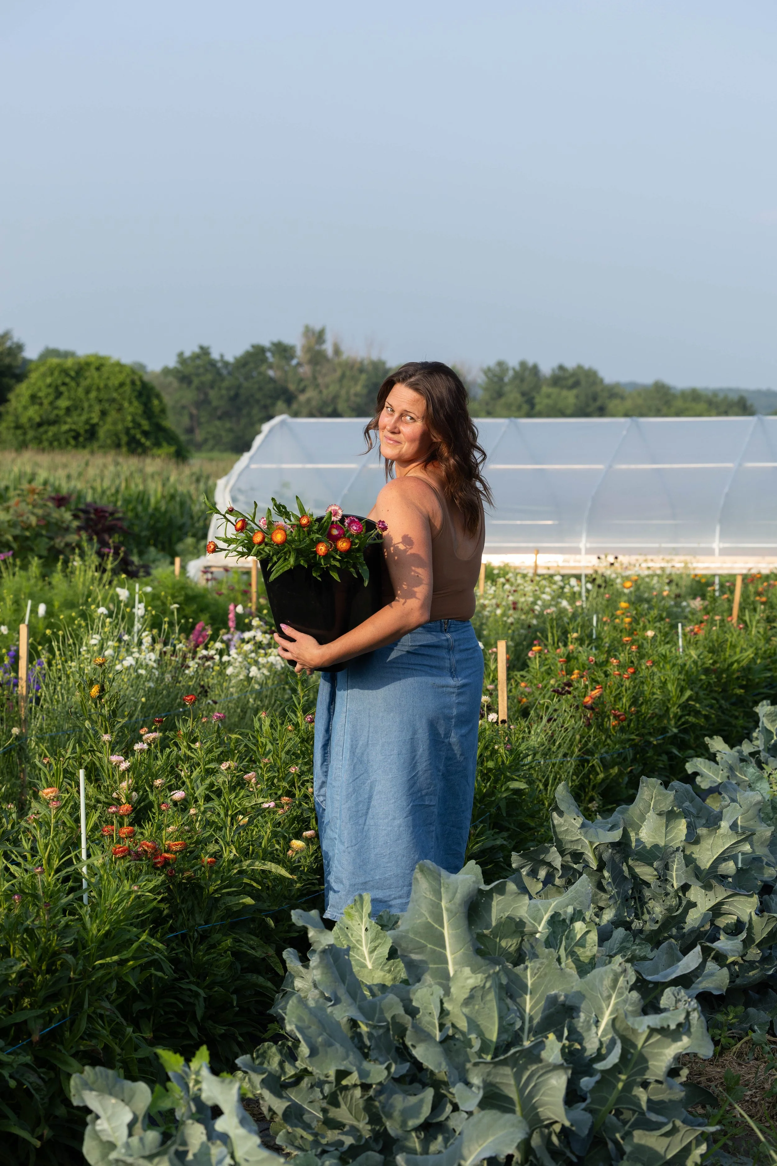 You will often find me barefoot in the field or greenhouse, tending to our carefully selected variety of flowers. We grow dahlias, zinnias, snap dragons, lisianthus, feverfew, scabiosa, straw flower, lots of cool foliage, and more!